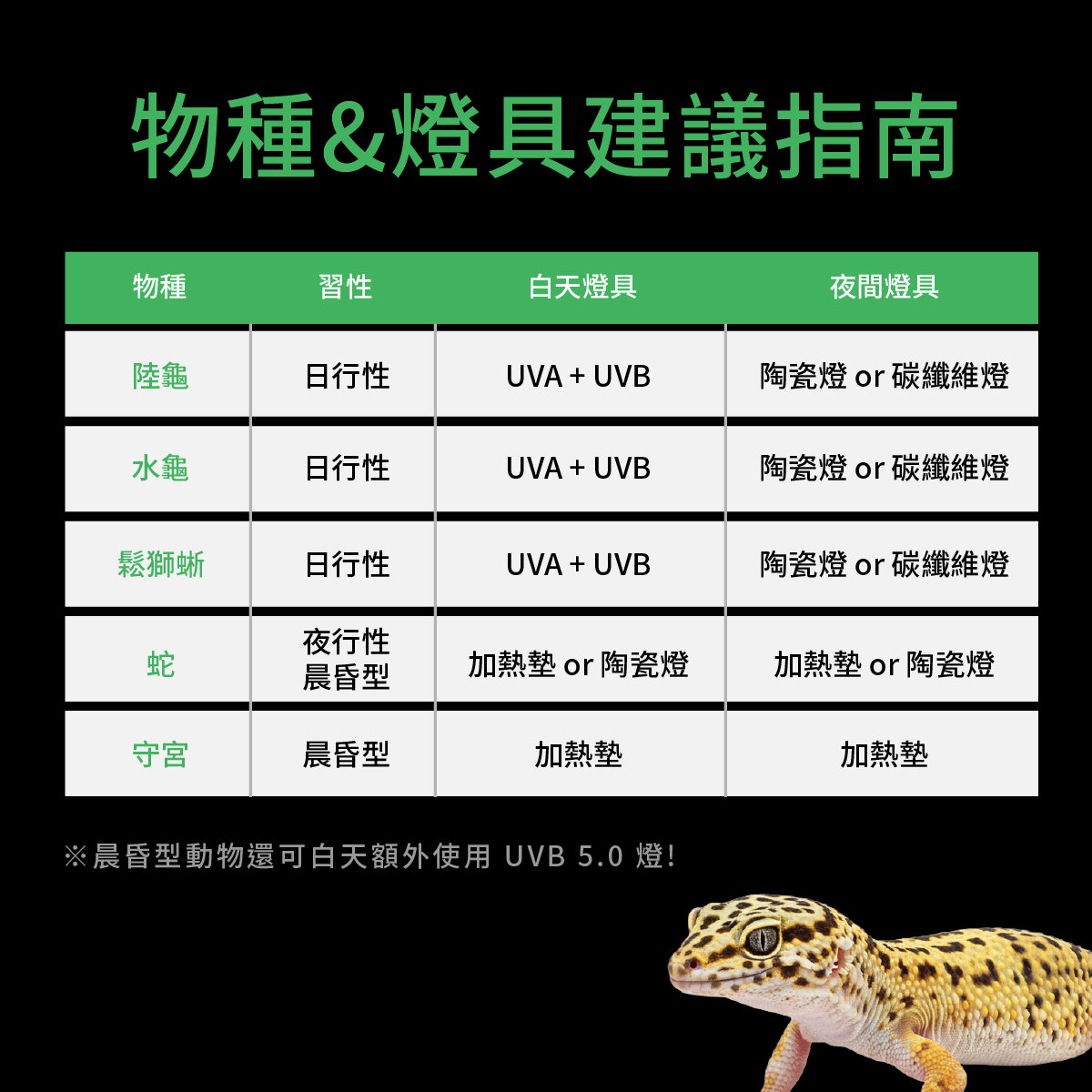 備註: 晨昏行動物還可白天額外使用 UVB 5.0 燈!