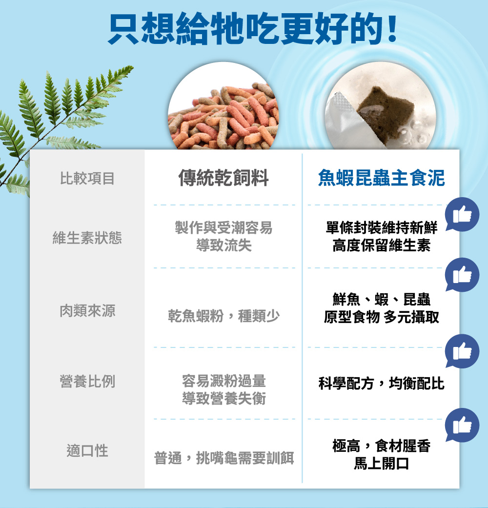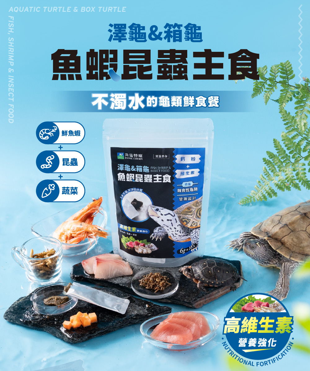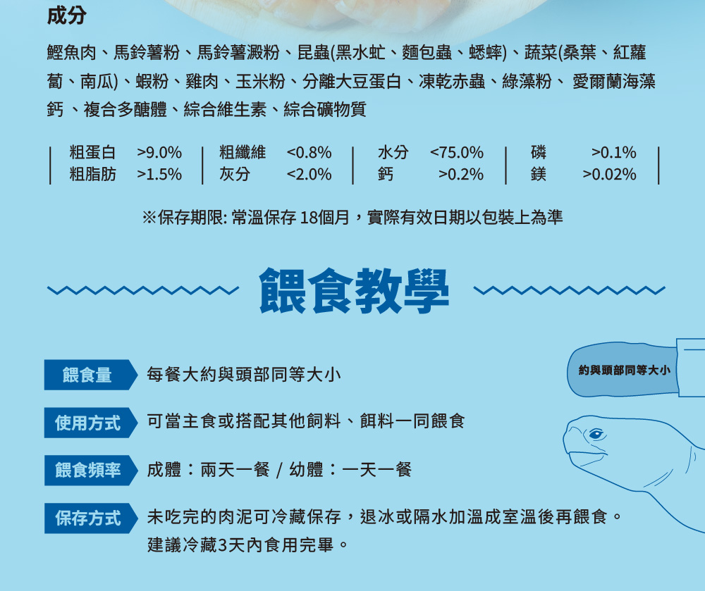 成分: 鰹魚肉、馬鈴薯粉、馬鈴薯澱粉、昆蟲(黑水虻、麵包蟲、蟋蟀)、蔬菜(桑葉、紅蘿蔔、南瓜)、蝦粉、雞肉、玉米粉、分離大豆蛋白、凍乾赤蟲、綠藻粉、 愛爾蘭海藻鈣 、複合多醣體、綜合維生素、綜合礦物質
